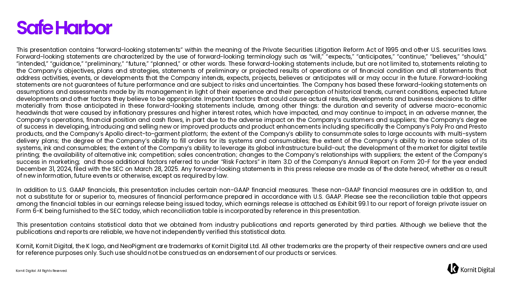 Kornit Digital. All Rights Reserved. Safe Harbor This presentation contains “forward - looking statements” within the meaning of the Private Securities Litigation Reform Act of 1995 and other U . S . securities laws . Forward - looking statements are characterized by the use of forward - looking terminology such as “will,” “expects,” “anticipates,” “continue,” “believes,” “should,” “intended,” “guidance,” “preliminary,” “future,” “planned,” or other words . These forward - looking statements include, but are not limited to, statements relating to the Company’s objectives, plans and strategies, statements of preliminary or projected results of operations or of financial condition and all statements that address activities, events, or developments that the Company intends, expects, projects, believes or anticipates will or may occur in the future . Forward - looking statements are not guarantees of future performance and are subject to risks and uncertainties . The Company has based these forward - looking statements on assumptions and assessments made by its management in light of their experience and their perception of historical trends, current conditions, expected future developments and other factors they believe to be appropriate . Important factors that could cause actual results, developments and business decisions to differ materially from those anticipated in these forward - looking statements include, among other things : the duration and severity of adverse macro - economic headwinds that were caused by inflationary pressures and higher interest rates, which have impacted, and may continue to impact, in an adverse manner, the Company’s operations, financial position and cash flows, in part due to the adverse impact on the Company’s customers and suppliers ; the Company’s degree of success in developing, introducing and selling new or improved products and product enhancements including specifically the Company’s Poly Pro and Presto products, and the Company’s Apollo direct - to - garment platform ; the extent of the Company’s ability to consummate sales to large accounts with multi - system delivery plans ; the degree of the Company’s ability to fill orders for its systems and consumables ; the extent of the Company’s ability to increase sales of its systems, ink and consumables ; the extent of the Company’s ability to leverage its global infrastructure build - out ; the development of the market for digital textile printing ; the availability of alternative ink ; competition ; sales concentration ; changes to the Company’s relationships with suppliers ; the extent of the Company’s success in marketing ; and those additional factors referred to under “Risk Factors” in Item 3 . D of the Company’s Annual Report on Form 20 - F for the year ended December 31 , 2024 , filed with the SEC on March 28 , 2025 . Any forward - looking statements in this press release are made as of the date hereof, whether as a result of new information, future events or otherwise, except as required by law . In addition to U . S . GAAP financials, this presentation includes certain non - GAAP financial measures . These non - GAAP financial measures are in addition to, and not a substitute for or superior to, measures of financial performance prepared in accordance with U . S . GAAP . Please see the reconciliation table that appears among the financial tables in our earnings release being issued today, which earnings release is attached as Exhibit 99 . 1 to our report of foreign private issuer on Form 6 - K being furnished to the SEC today, which reconciliation table is incorporated by reference in this presentation . This presentation contains statistical data that we obtained from industry publications and reports generated by third parties . Although we believe that the publications and reports are reliable, we have not independently verified this statistical data . Kornit , Kornit Digital, the K logo, and NeoPigment are trademarks of Kornit Digital Ltd . All other trademarks are the property of their respective owners and are used for reference purposes only . Such use should not be construed as an endorsement of our products or services .