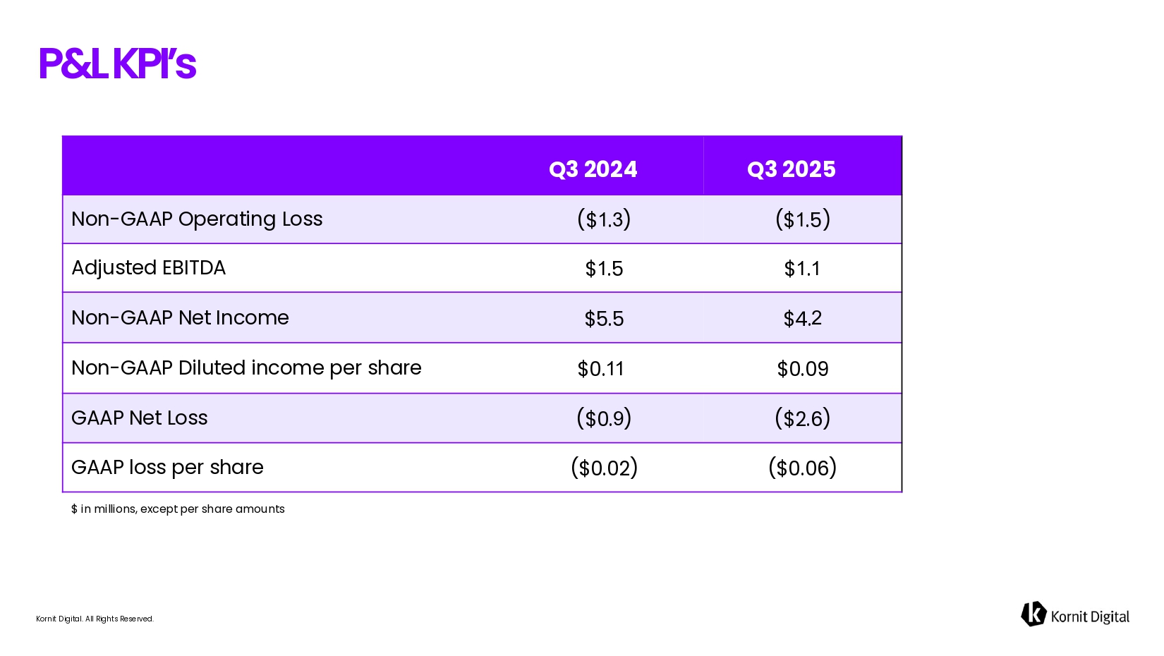 Kornit Digital. All Rights Reserved. P&L KPI’s Q3 2025 Q3 2024 ($ .5 ) ($ . ) Non - GAAP Operating Loss $ . $ .5 Adjusted EBITDA $ 4. $5.5 Non - GAAP Net Income $0.09 $ 0 . Non - GAAP Diluted income per share ($2.6) ($ 0. ) GAAP Net Loss ($0.06) ($0.02) GAAP loss per share $ in millions, except per share amounts