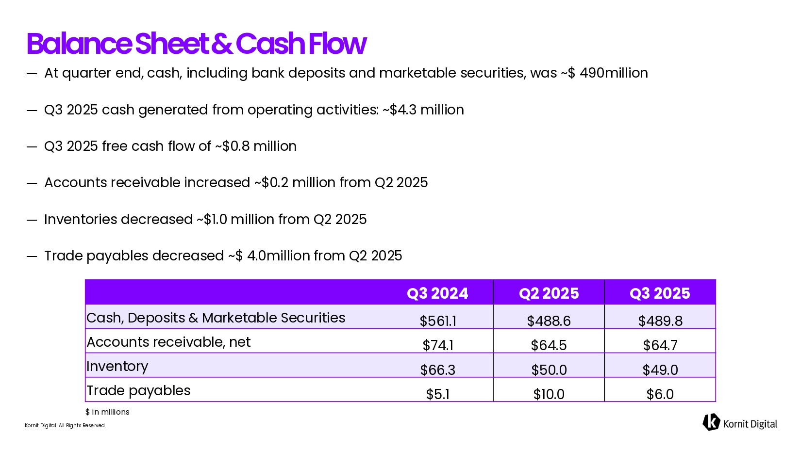 Kornit Digital. All Rights Reserved. ― At quarter end, cash, including bank deposits and marketable securities, was ~$ ʧ 90 million ― Q 3 2025 cash generated from operating activities: ~$ 4.3 million ― Q 3 2025 free cash flow of ~$ 0.8 million ― Accounts receivable increase d ~$ 0.2 million from Q 2 2025 ― Inventories decreased ~$ 1.0 million from Q 2 202 ʨ ― Trade payables decreased ~$ ʧ .0 million from Q 2 202 ʨ Balance Sheet & Cash Flow Q3 2025 Q2 2025 Q3 2024 $489.8 $488.6 $561.1 Cash, Deposits & Marketable Securities $64.7 $64.5 $74.1 Accounts r eceivable, net $49.0 $50.0 $66.3 Inventory $6.0 $10.0 $5.1 Trade p ayables $ in millions