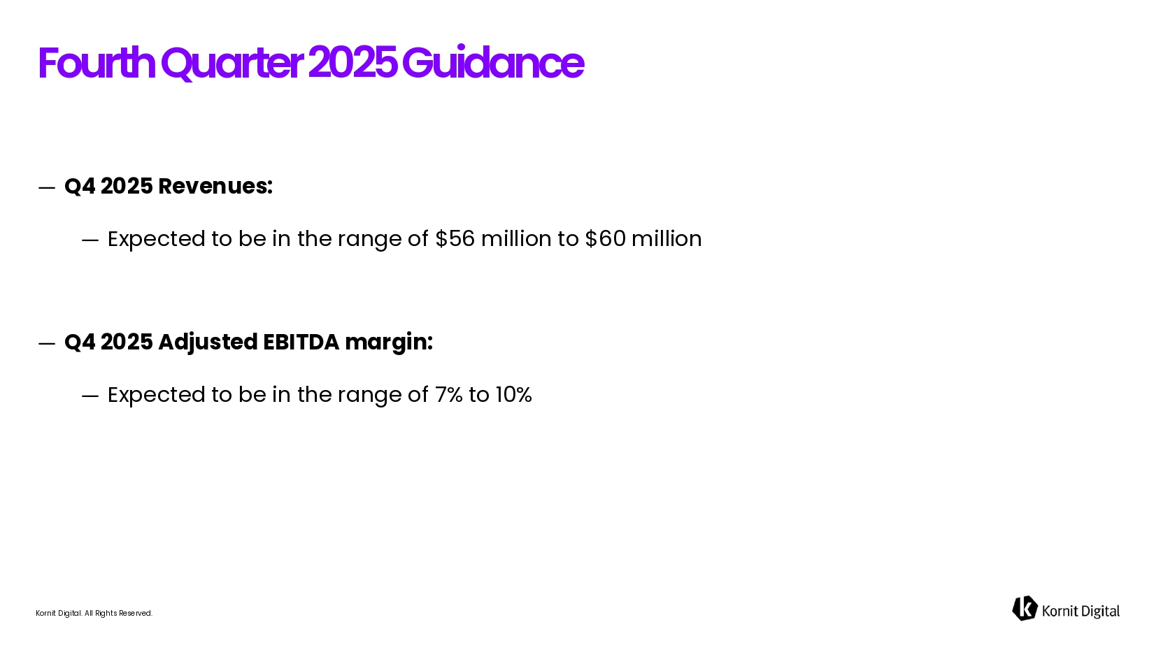 For the fourth quarter of 2025, the Company expects revenues to be in the range of $56 million to $60 million and adjusted EBITDA margin between 7% and 10%.